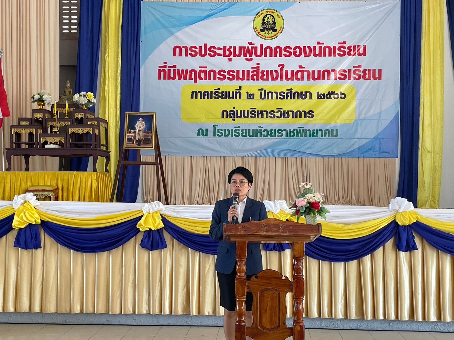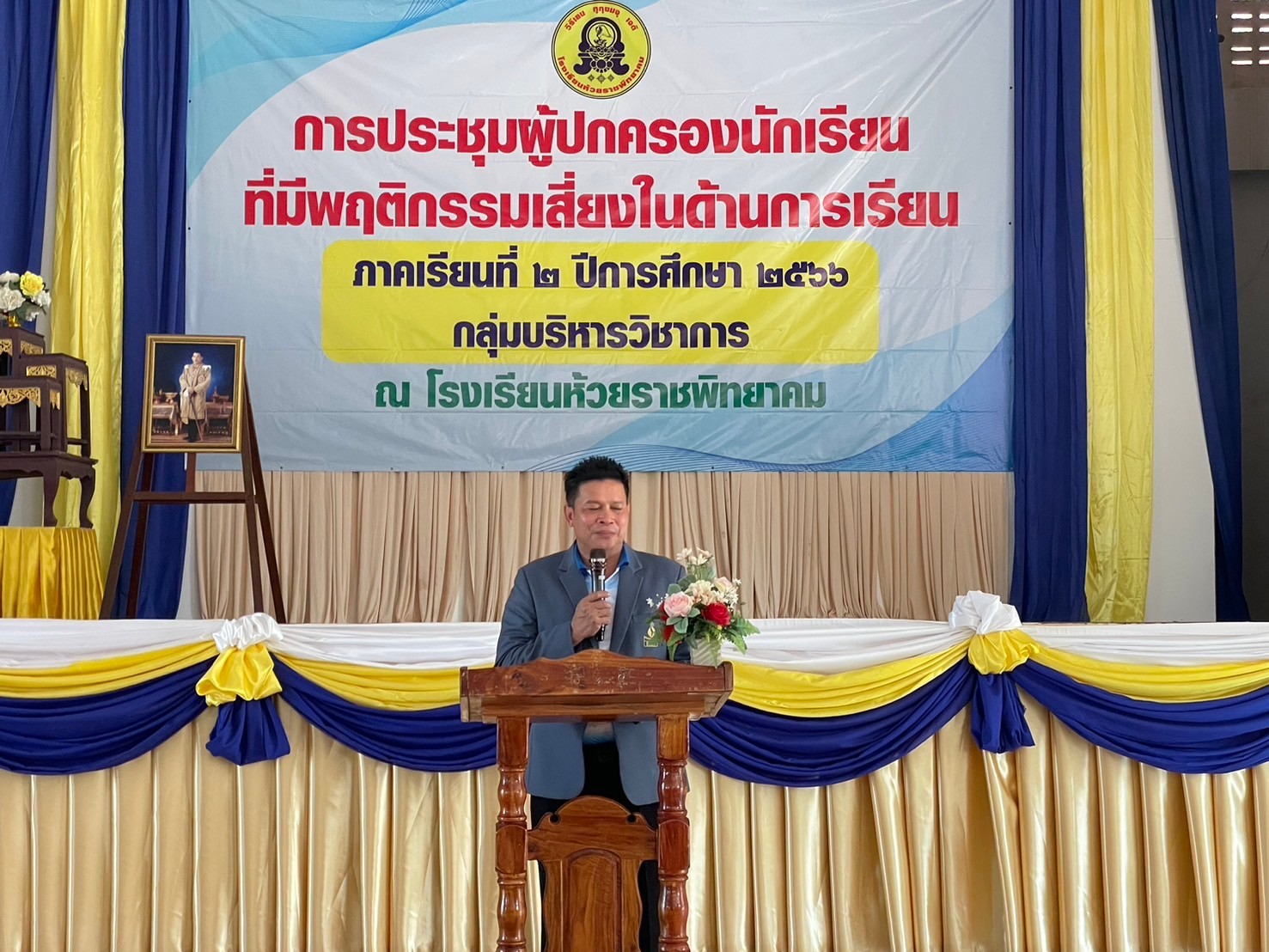 ในภาคเรียนที่ 2 ปีการศึกษา 2566 โดยมีนายจินดา กรองทอง ผู้อำนวยการโรงเรียนห้วยราชพิทยาคม เป็นประธานในพิธีและกล่าวต้อนรับผู้ปกครอง ว่าที่ร้อยตรีหญิงกรชนก ธรรมิภักดิ์ รองผู้อำนวยการโรงเรียน กล่าวชี้แจงถึงแนวทางช่วยเหลือนักเรียน รายละเอียด ขั้นตอนการดำเนินการ ให้ผู้ปกครองรับทราบเพื่อร่วมกันช่วยเหลือนักเรียนให้แก้ไขผลการเรียนให้แล้วเสร็จก่อนสิ้นปีการศึกษา